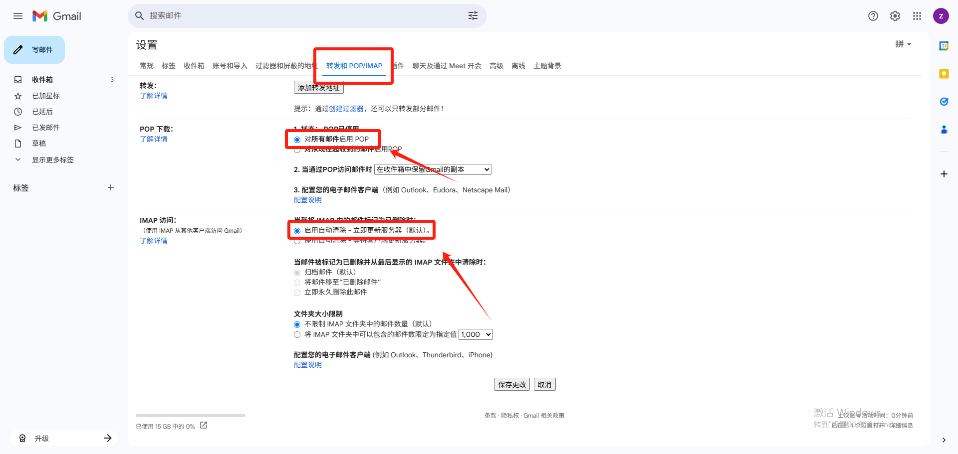 点击【转发和POP/IMAP】,启用IMAP,保存更改