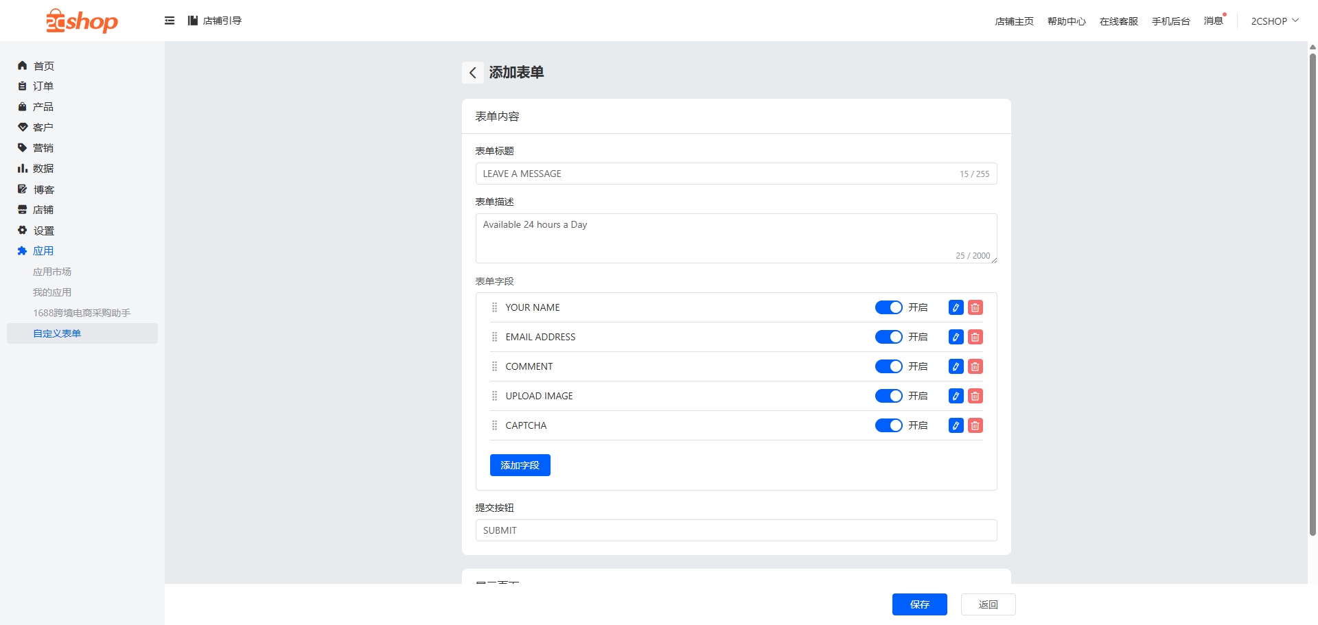 接下来需要到【店铺】-【主题编辑】里,添加此表单至目标页面。增加模块操作步骤详见:https://www.2cshop.com/helping/629.html