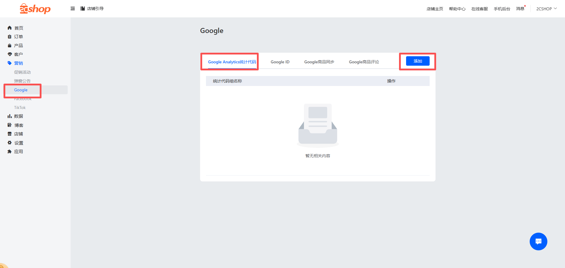 将复制的代码粘贴到后台,在营销-Google Google Analytics统计代码中,点击【添加】
