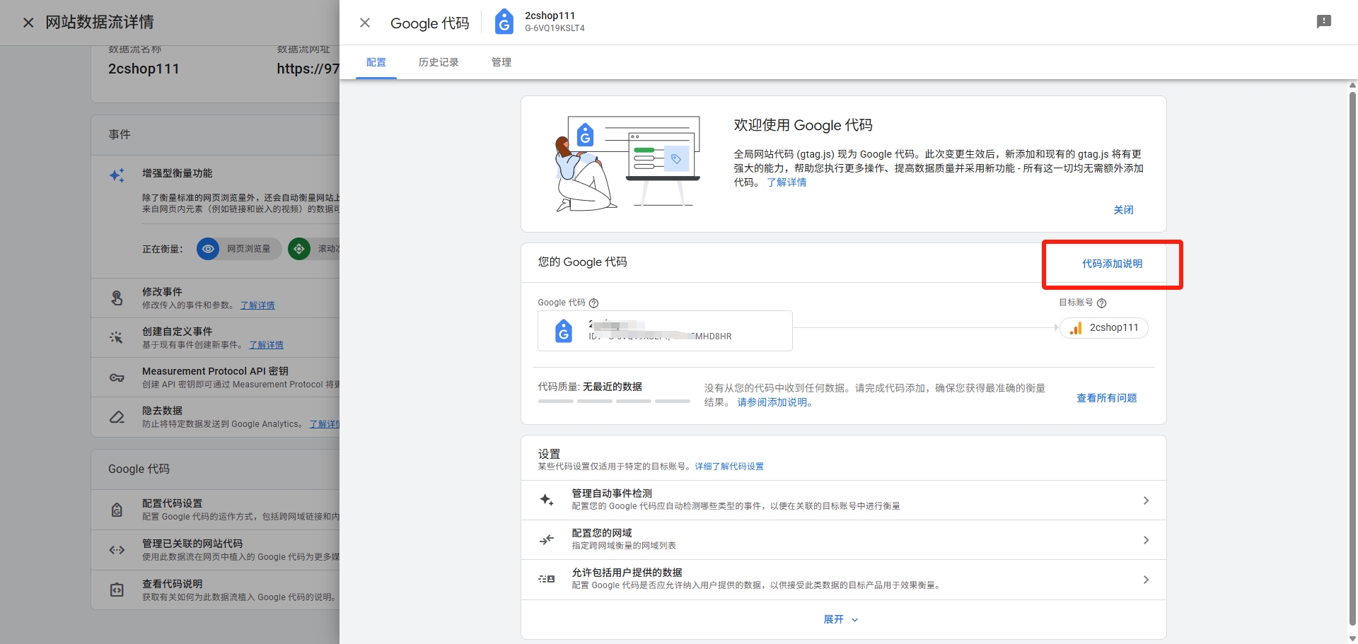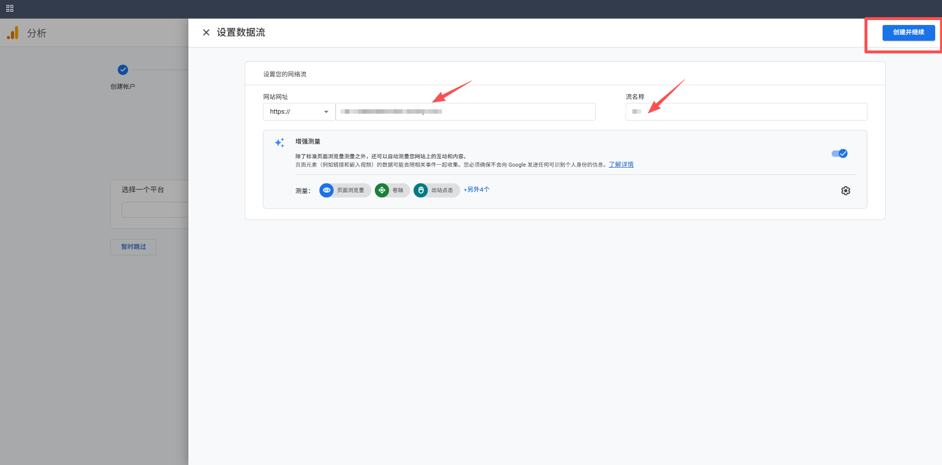 填写网站网址,填写数据流名称,点击【创建并继续】