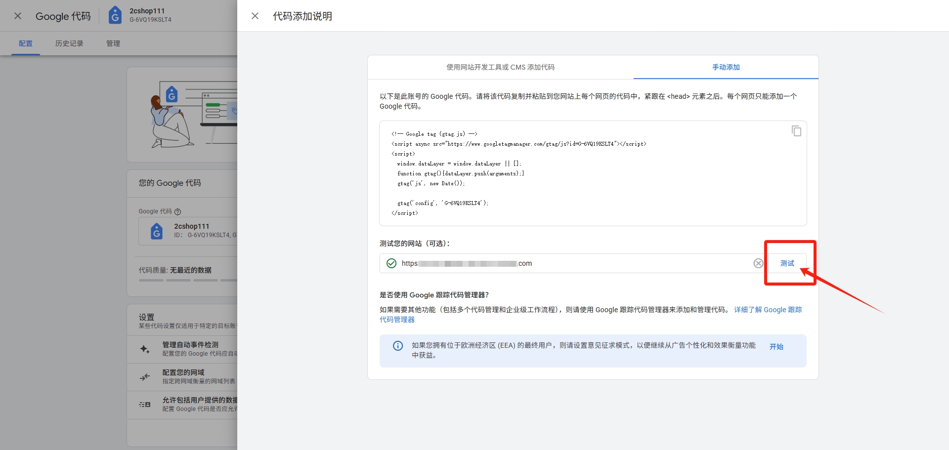 回到Google Analytics后台,点击测试网址前出现绿色对钩即可