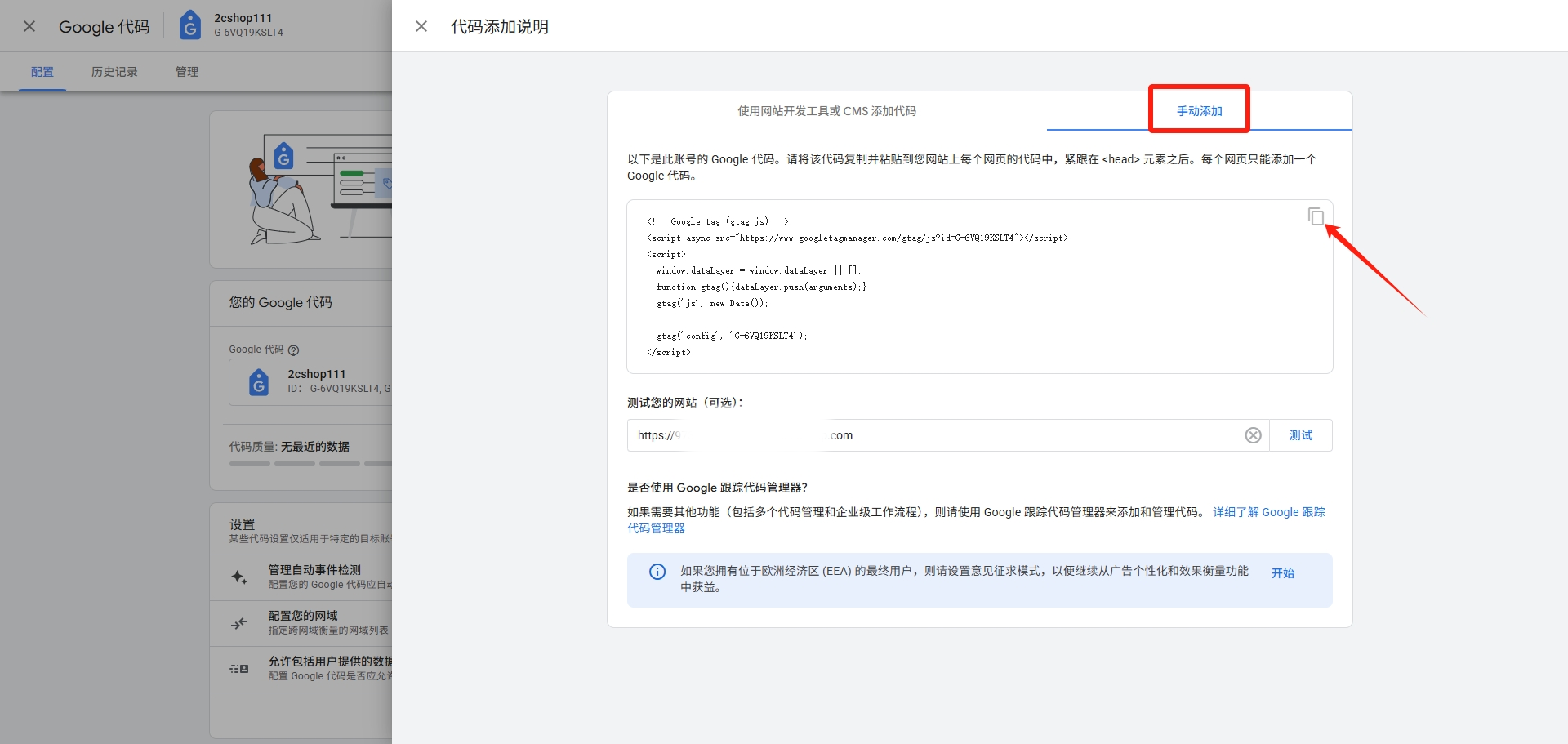 选择【手动安装】,点击复制按钮,复制代码